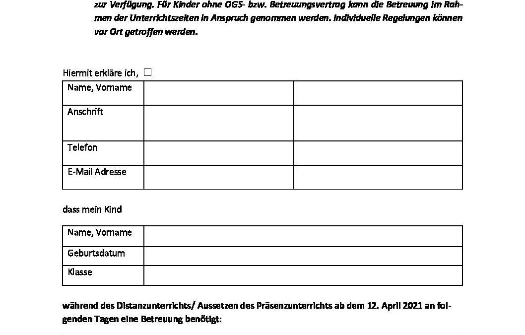 Anmeldung Betreuung ab dem 12.04.2021