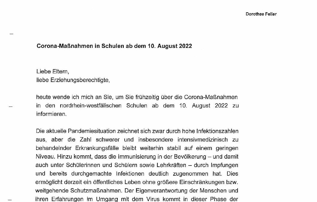Brief der Ministerin an die Eltern_Erziehungsberechtigten aller SuS zu Corona-Maßnahmen ab 10.08.2022