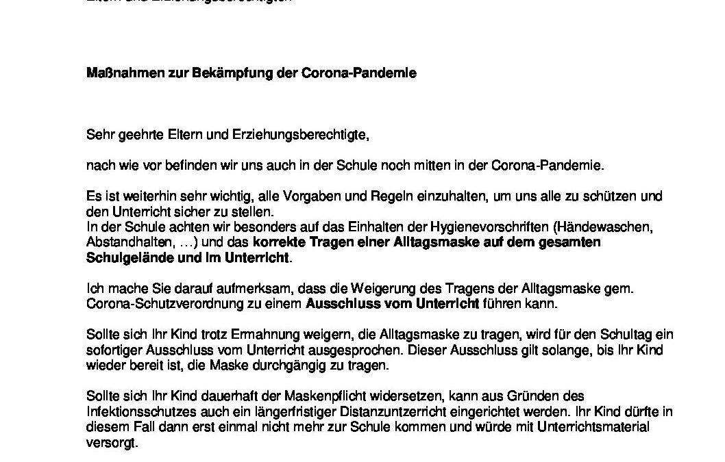 Elternbrief Corona Maskenpflicht