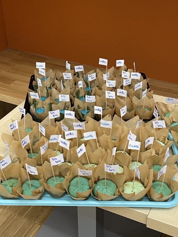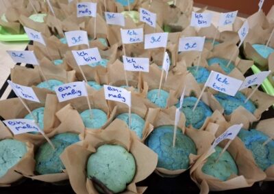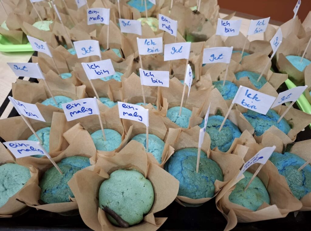 Außerdem wurden 220 blaue Muffins von den Schulsozialarbeitenden und einigen Schülerinnen und Schülern gebacken, die an alle in der Schule verteilt wurde.