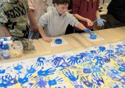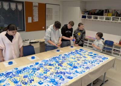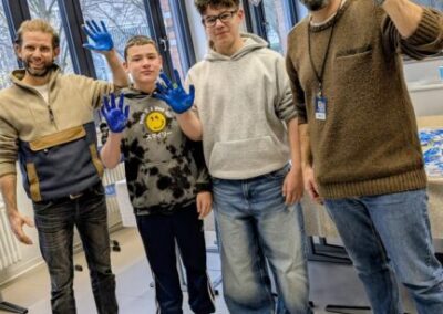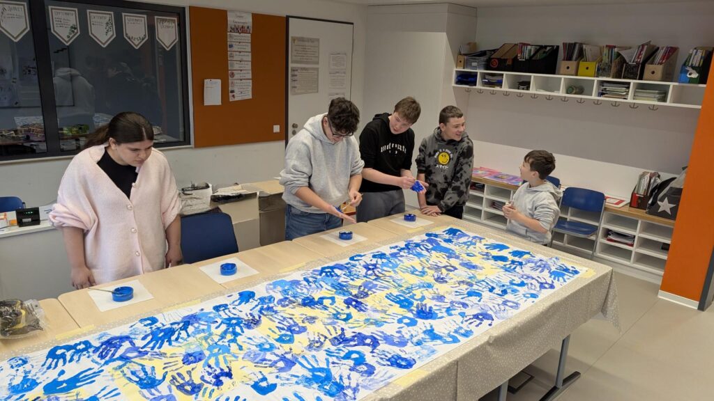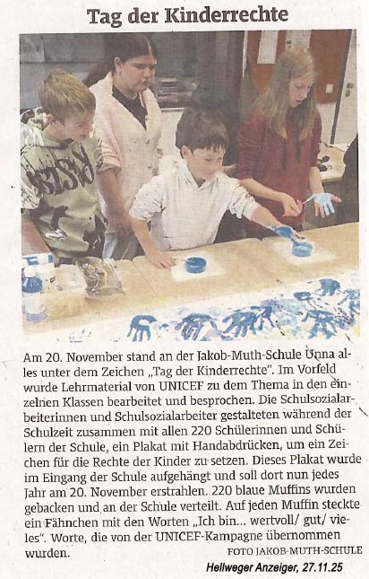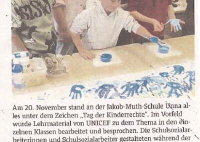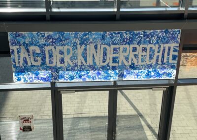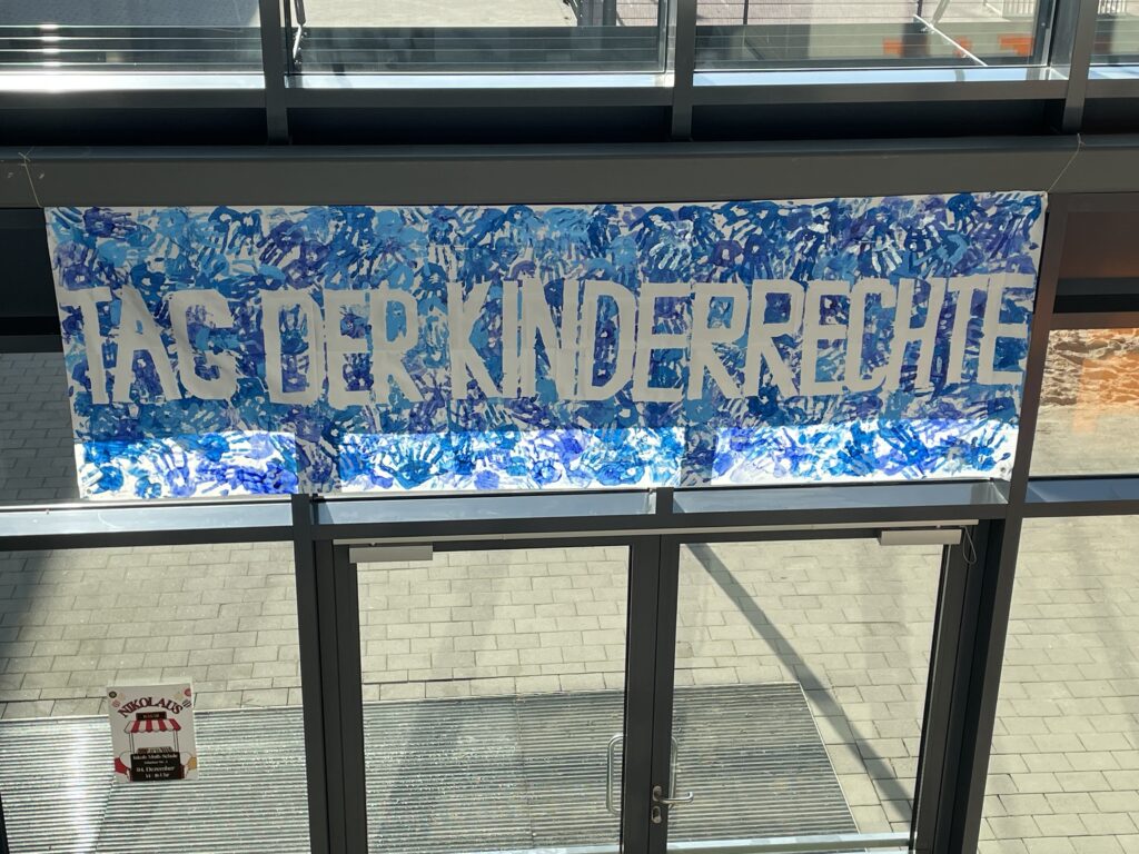 Im Vorfeld haben viele Klassen zum Thema Kinderrechte im Unterricht gearbeitet und darüber gesprochen. Unsere Schulsozialarbeiter und Schulsozialarbeiterinnen haben mit allen 220 Schülerinnen und Schülern der Schule, ein Plakat mit Handabdrücken gestaltet, um ein Zeichen für die Rechte der Kinder zu setzen. Dieses Plakat hängt nun im Eingang und wird jedes Jahr wieder dort aufgehängt